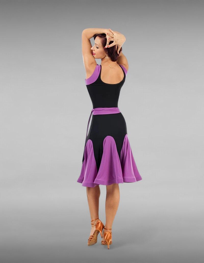 Let your spirit shine with our vibrant "Dresses to Dance In." This Latin dance dress combines black with a pop of color at the armhole, belt, and wedges on the skirts, adding a striking visual element. The sun skirt design ensures freedom of movement, making it ideal for any dance performance.