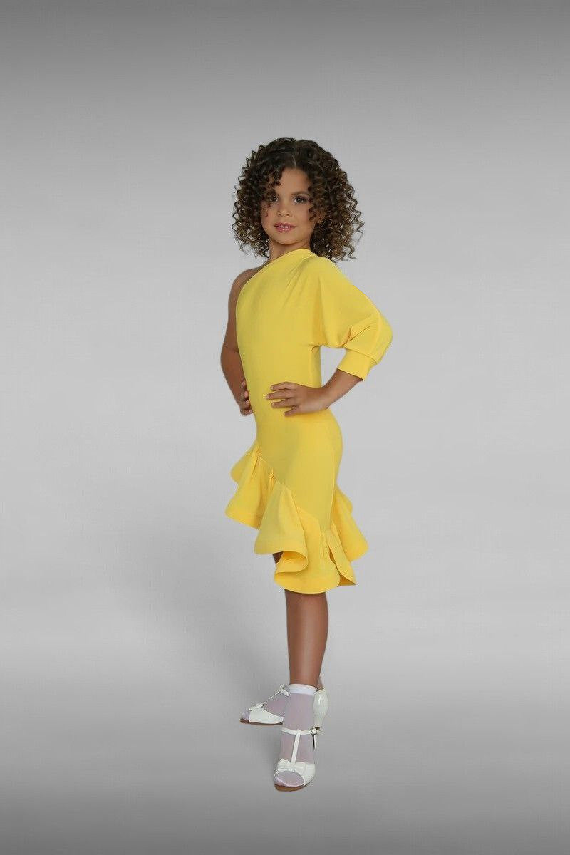Unleash your vibrant spirit on the dance floor with this chic yellow dance dress, designed for the ultimate ballroom performance. With an asymmetrical design, this dress embodies elegance and flair. The dress features an elbow-length sleeve on the right, seamlessly cut from the main body, attached at the elbow with a slender cuff for an avant-garde appeal. On the left, the shoulder is artfully exposed, evoking a sense of balance with the overall design. The dress' hem varies in length, modestly reaching the mid-calf on the right and playfully rising above the knee on the left. A generous ruffle adorns the lower edge of the dress, adding a hint of volume to the otherwise snug-fitting silhouette. Crafted from supple black knit fabric, this dress promises superb elasticity, ensuring unhindered movements and the utmost convenience for your dance performance.